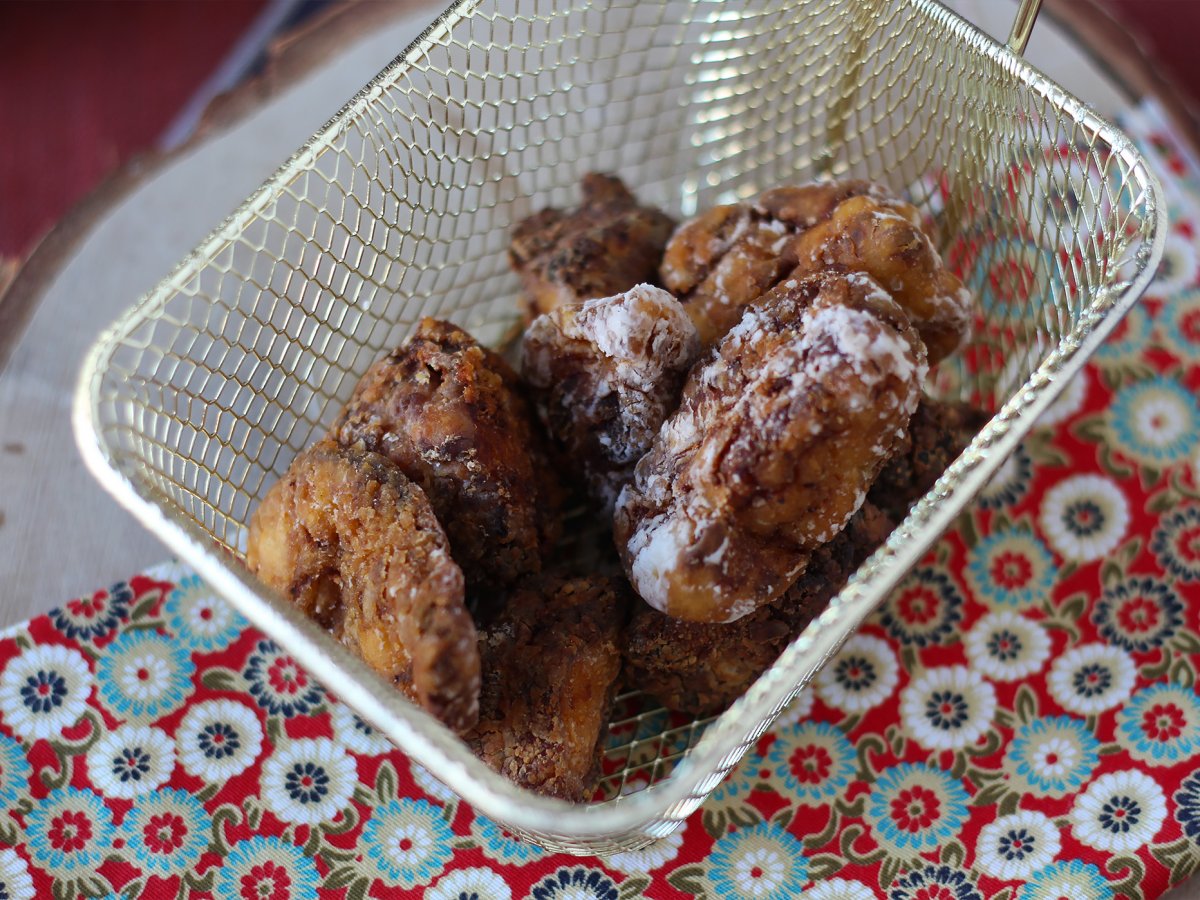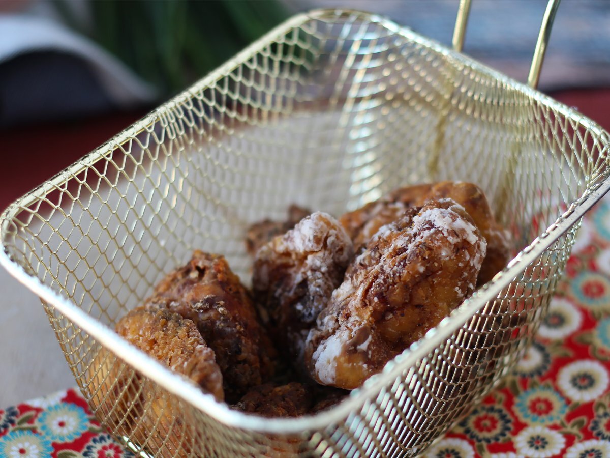 Das Öl auf 170 °C erhitzen und die Hähnchenstücke (nicht alle auf einmal) 3 Minuten lang unter gelegentlichem Wenden hineingeben. Vorsicht vor Spritzern!