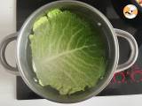 Füllen Sie die Kohlblätter mit etwa 3 Esslöffeln Füllung pro Blatt.