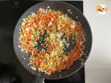 Den gehackten Knoblauch und die gehackte Zwiebel in Olivenöl anbraten. Die klein geschnittene Karotte und den Lauch dazugeben und einige Minuten bei mittlerer Hitze anbraten. Mit Salz und Pfeffer würzen.