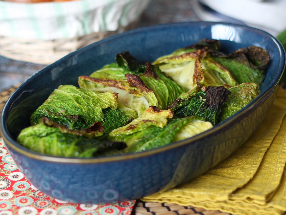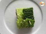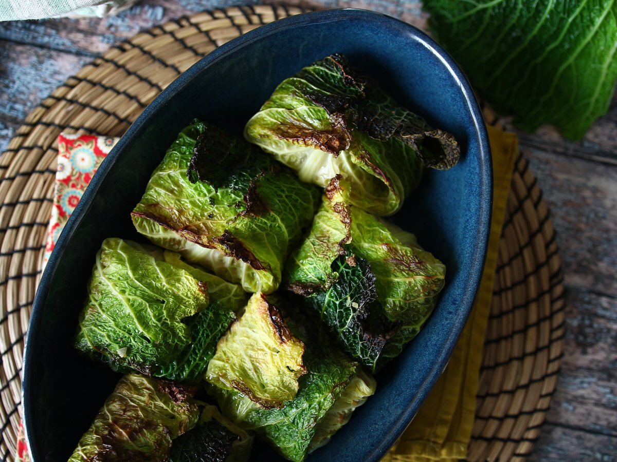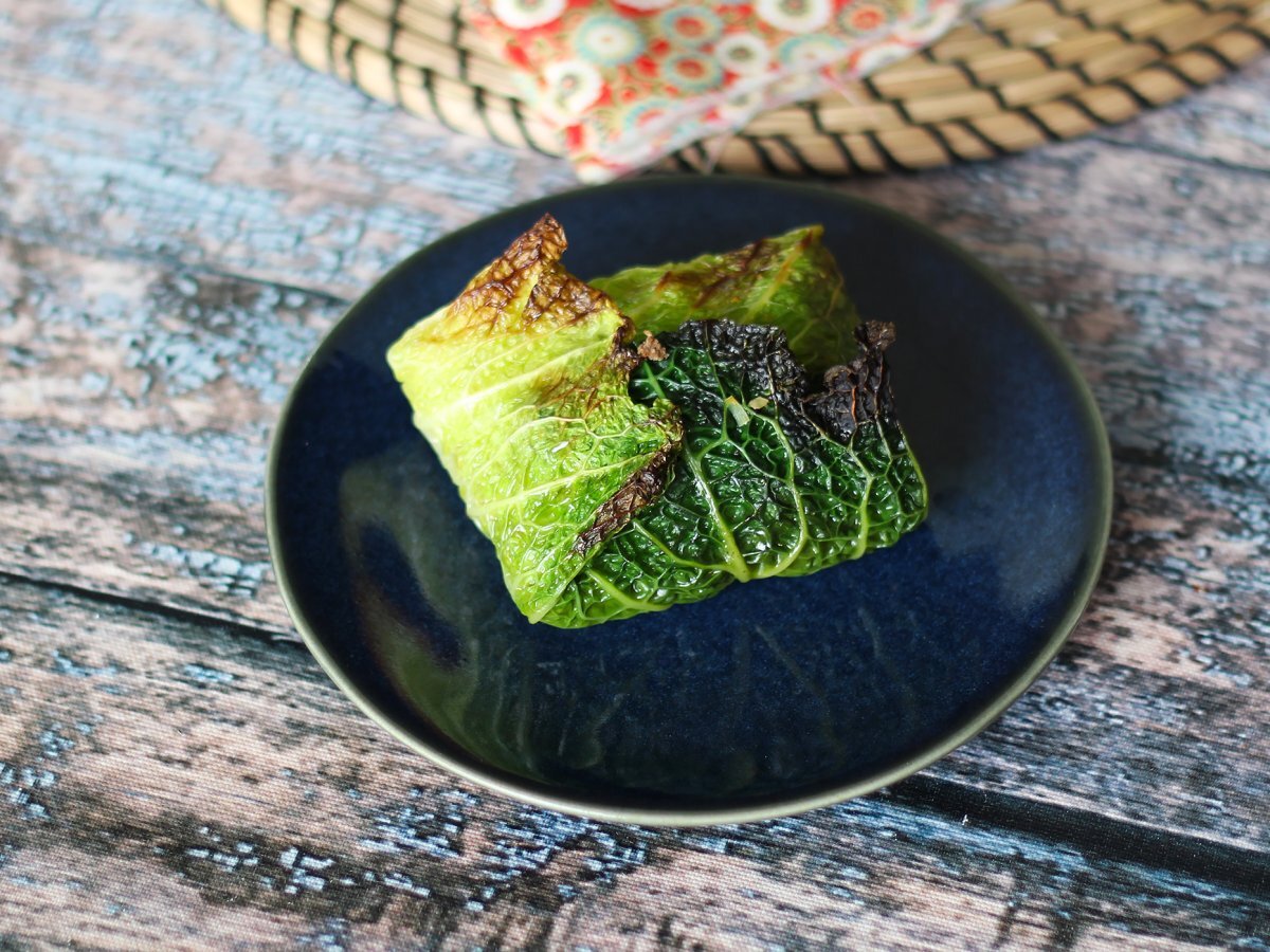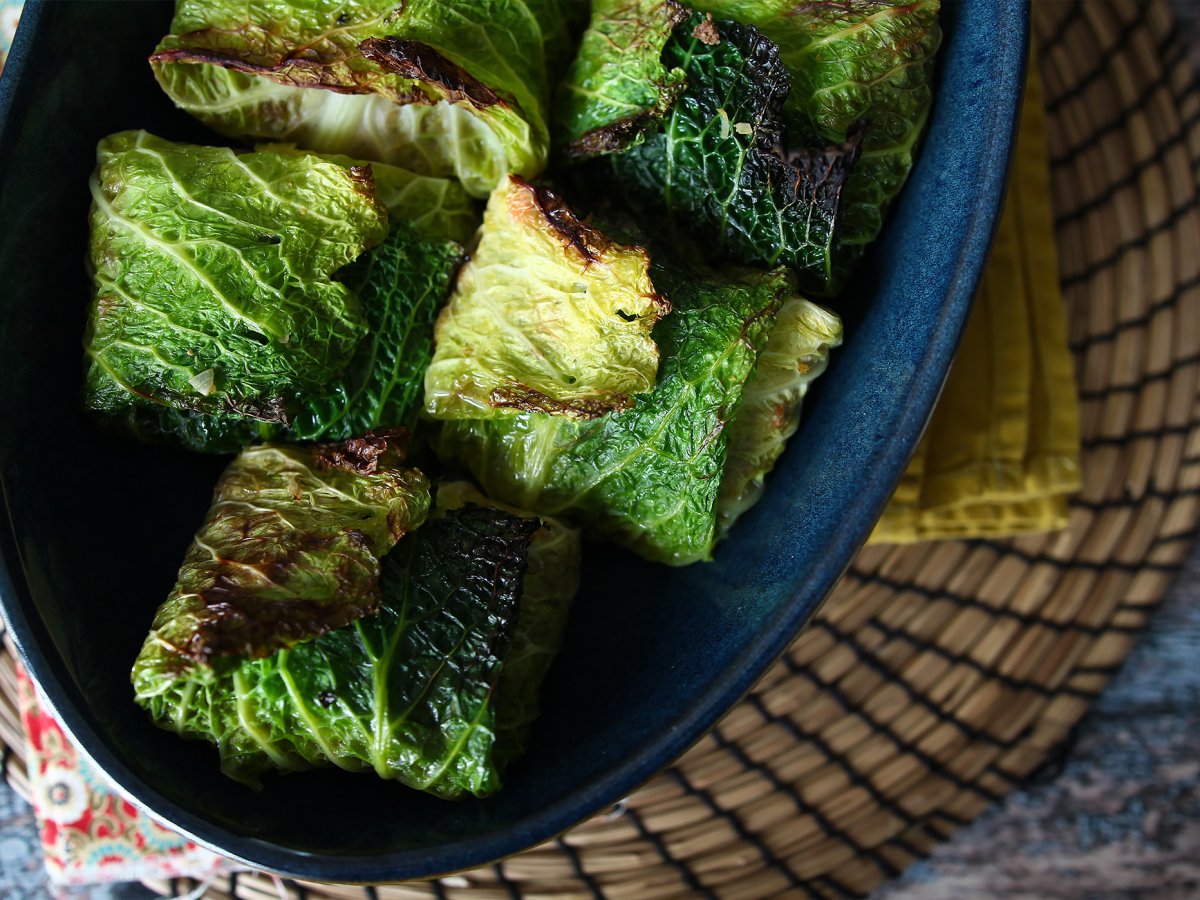 Blanchiere die Kohlblätter 1 Min. in kochendem Wasser und lege sie dann in Eiswasser.