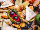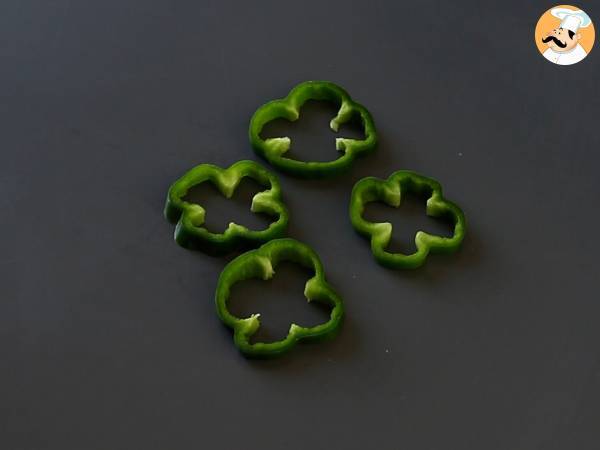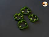 Tomaten und Paprika in kleine Stücke schneiden. Die Zwiebeln schälen und in Stücke schneiden. Von der Paprika einige Scheiben der Breite nach abschneiden, um Blumen zu machen.