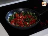 Dann die Paprika und die Tomaten dazugeben und ca. 3 Minuten bei mittlerer/hoher Hitze anbraten.