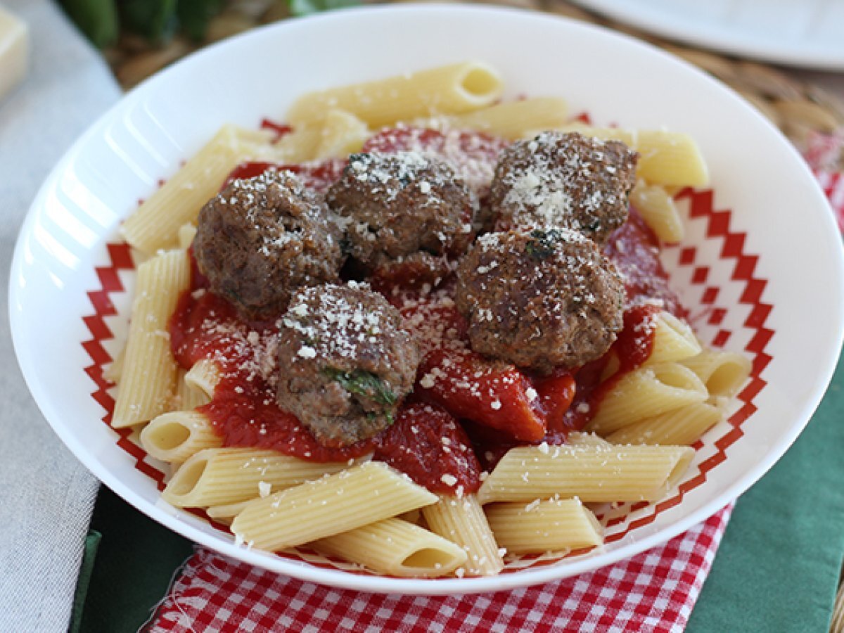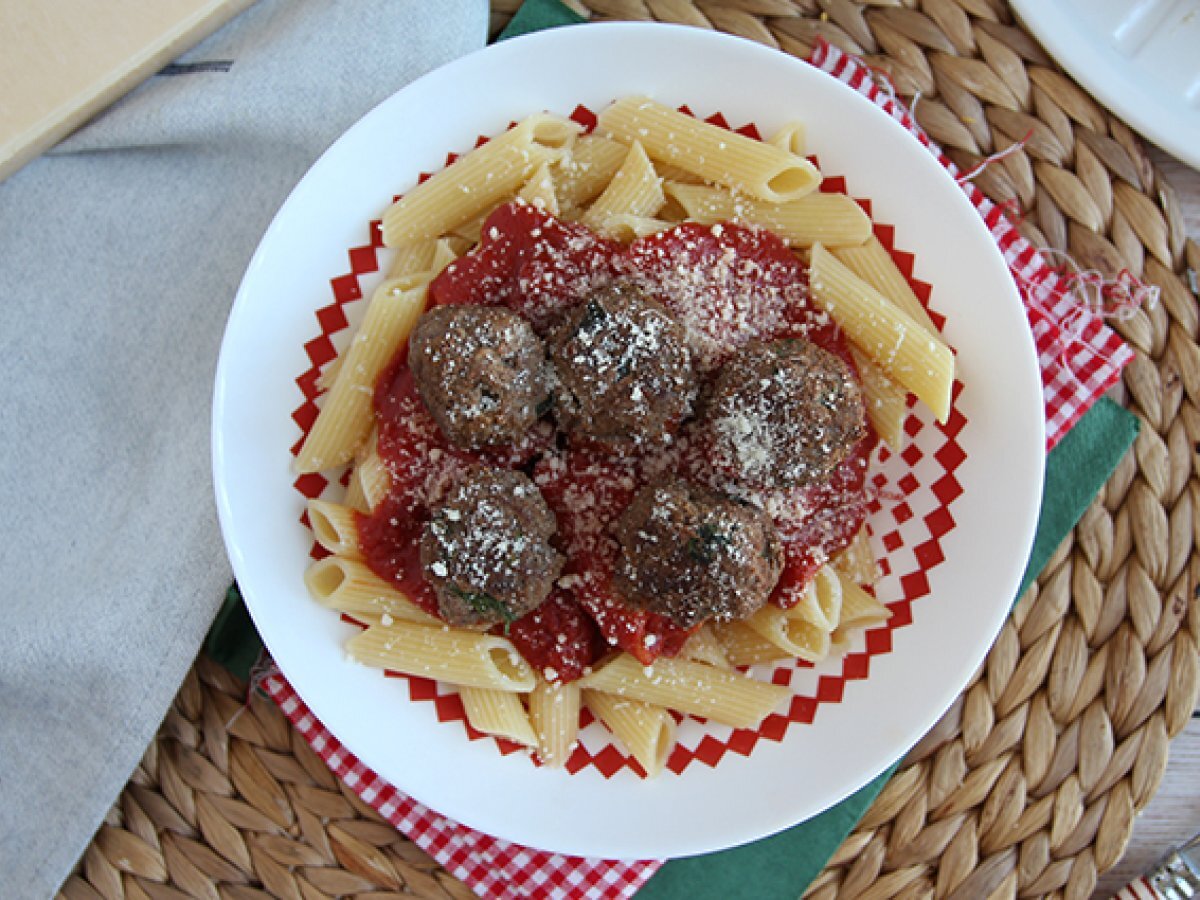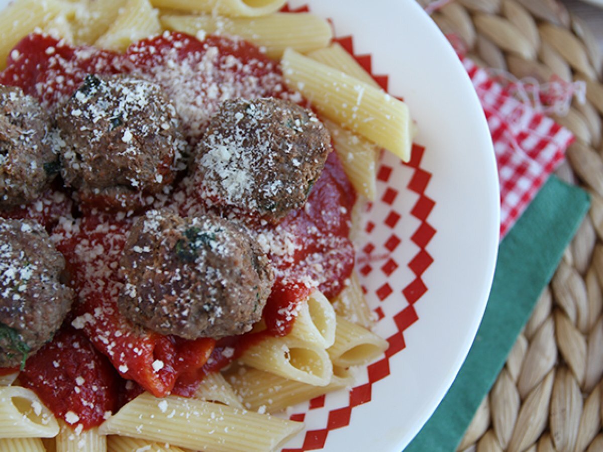 Auf einem Teller mit Nudeln und Tomatensauce servieren. Ein wenig Parmesan darüber streuen.