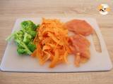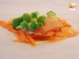 Schneiden Sie ein Quadrat aus Backpapier aus. Zusammensetzen: 1/3 des Papiers ausschneiden und die Hälfte der Möhren darauf legen. Etwas salzen, pfeffern und mit 1 Spritzer Olivenöl beträufeln. Die Hälfte des Hähnchens darauf legen. Wieder mit Salz und einem Spritzer Olivenöl würzen. Zum Schluss eine Handvoll Brokkoli, einen Spritzer Olivenöl, Salz und Pfeffer hinzufügen.