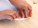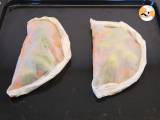 Falten Sie das Blatt. Alles sollte in der Mitte sein. Schließen Sie das Papier allmählich und falten Sie es zu einem Dreieck. Die Faltung sollte so erfolgen, als wäre es eine Calzone. Die Ränder gut verschließen, damit die Luft beim Backen nicht entweicht.