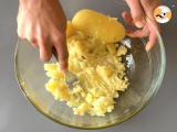 Als erstes beginnen wir mit der Zubereitung der Kartoffelknödel: Die Kartoffeln (mit der ganzen Schale) ca. 35 Minuten köcheln lassen. Nach dieser Zeit schälen und zerquetschen Sie sie, indem Sie sich mit einer Gabel (oder einem Kartoffelknacker) helfen.