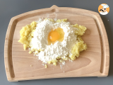Nun legen Sie die zerkleinerten Kartoffeln auf ein Brett, fügen Sie das Mehl, das Ei und eine Prise Salz hinzu. Fangen Sie an, alles mit einer Gabel zu mischen, dann nach und nach mit den Händen kneten, bis der typische Panetto entsteht.