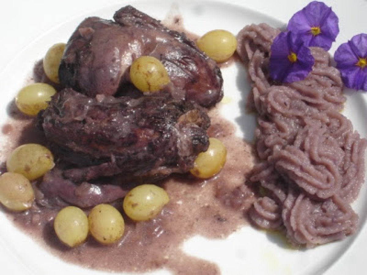 Herbstliches kaninchen mit weintrauben und mousseline aus vitelotte kartoffeln