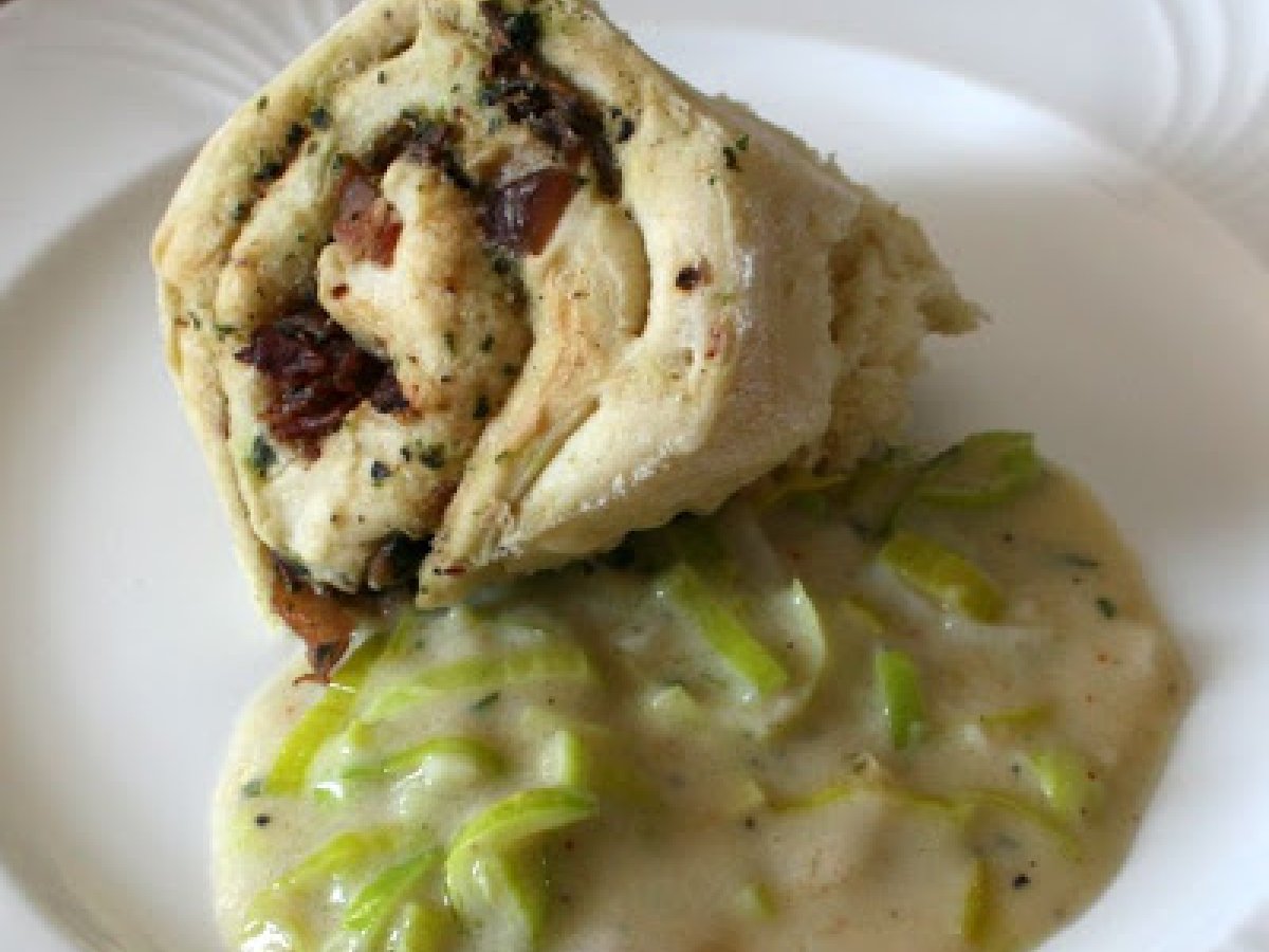 Die herzhaften Schneckennudeln mit der Lauchsauce servieren.