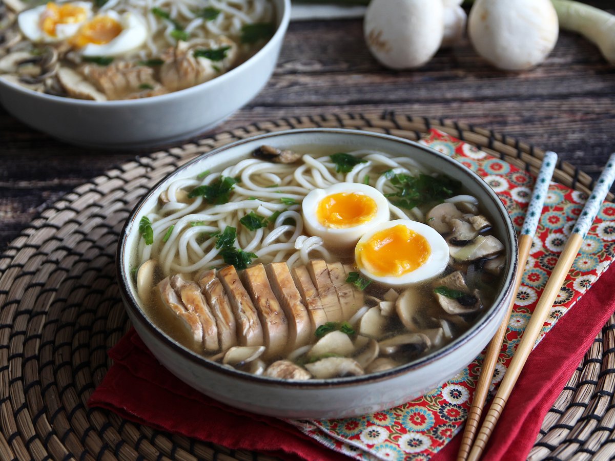Wenn wir über wohltuende asiatische Rezepte sprechen, denken wir sofort an Ramen! Eine sehr scharfe Brühe, die wir hier mit Ramen-Nudeln, Hühnchen und Pilzen garnieren wollten. Nicht zu vergessen das weich gekochte Ei, das Ihrem Gericht eine unwiderstehliche Note verleiht. Ein Rezept, bei dem Sie mehrere Vorbereitungen planen müssen, aber seien Sie versichert, dass alles extrem einfach zuzubereiten ist.