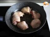 -Entfernen Sie die Knochen vom Huhn und schneiden Sie die Stücke in zwei Hälften. Die Butter mit dem Olivenöl in einer heißen Pfanne schmelzen und das Hähnchen darin von jeder Seite 5 Minuten anbraten.