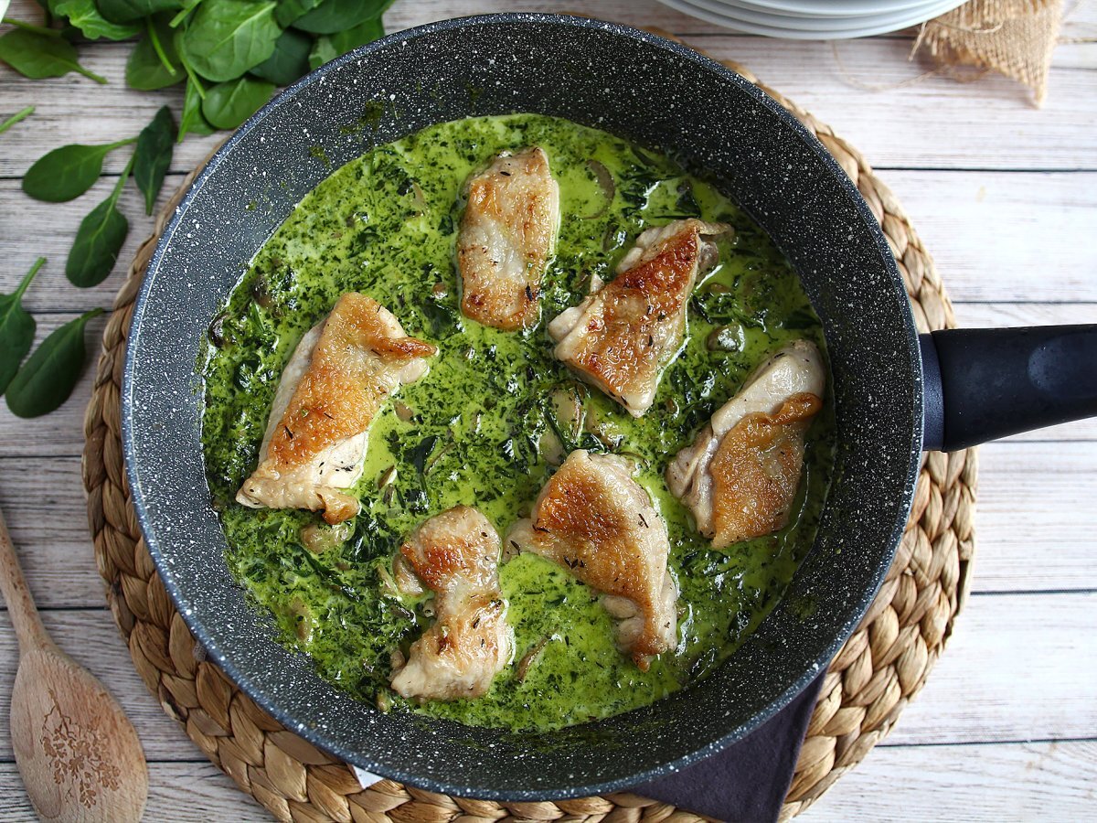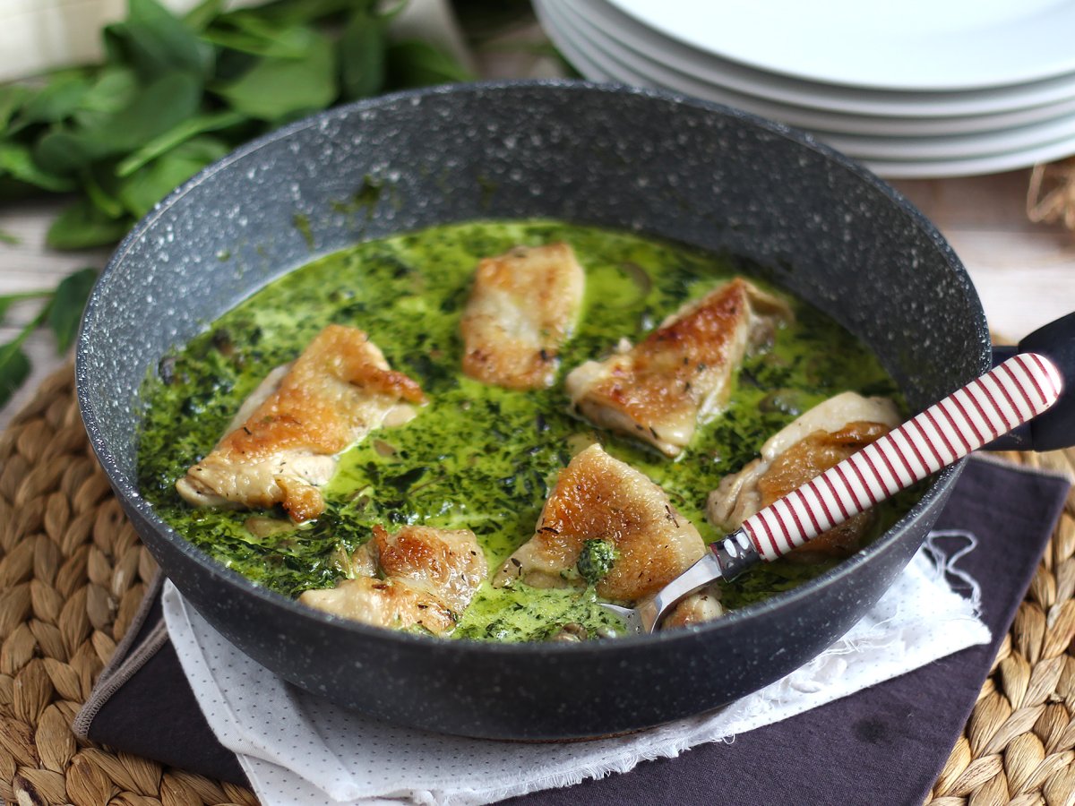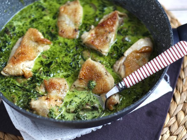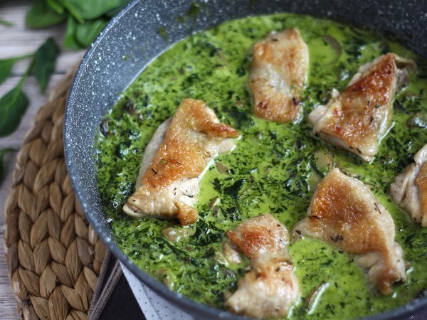 Keine Ideen fürs Abendessen? Machen Sie eine extra cremige Sauce mit Spinat und Pilzen und legen Sie dann Ihre Hähnchenschenkel hinein. Als Beilage müssen Sie nur noch Reis, Nudeln oder Kartoffeln kochen und schon ist das Essen fertig! Ist doch einfach richtig?!