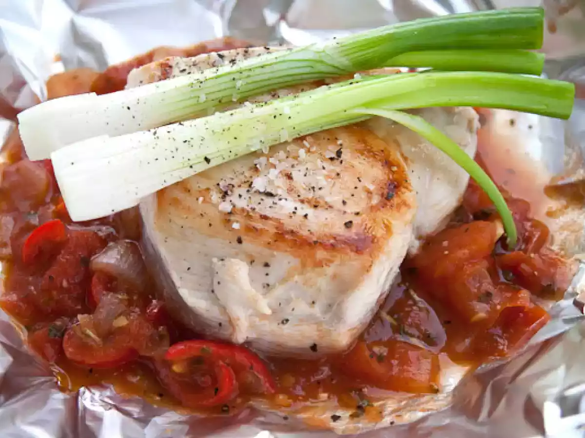 - Ein 60 cm langes Stück Aluminiumfolie geschnitten. Fügen Sie ein paar Esslöffel Letscho es.