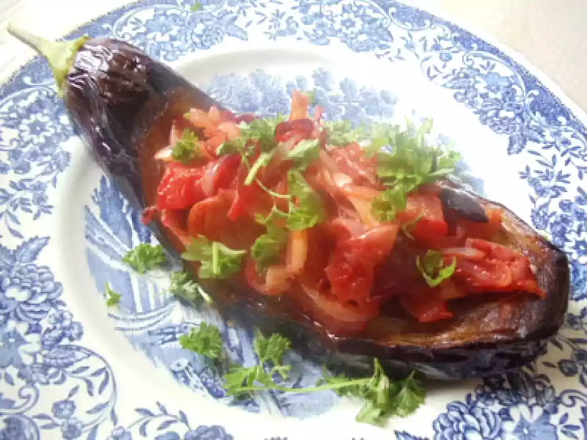 - Füllen Auberginhälften Füllung mit Zwiebel und kalt servieren.