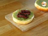 Die Pesto-Sauce auf den beiden Innenseiten des Brotes verteilen. Legen Sie sonnengetrocknete Tomaten auf die Unterseite des Brötchens.