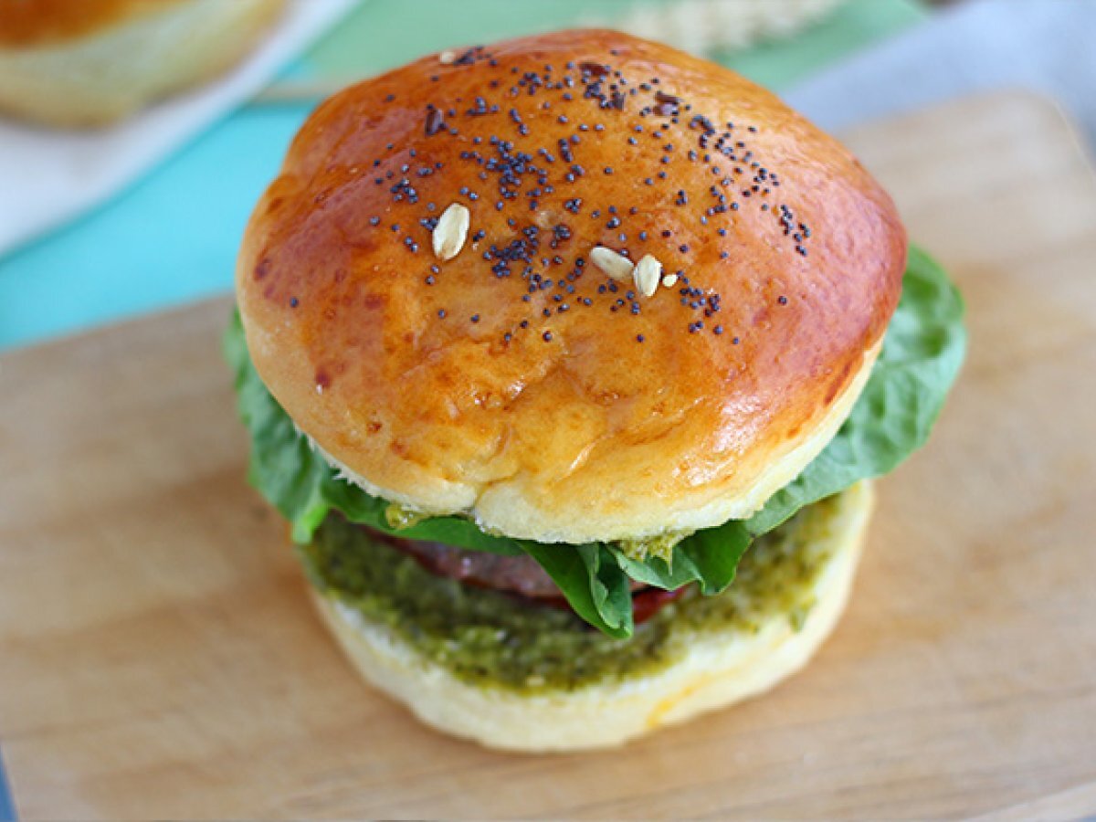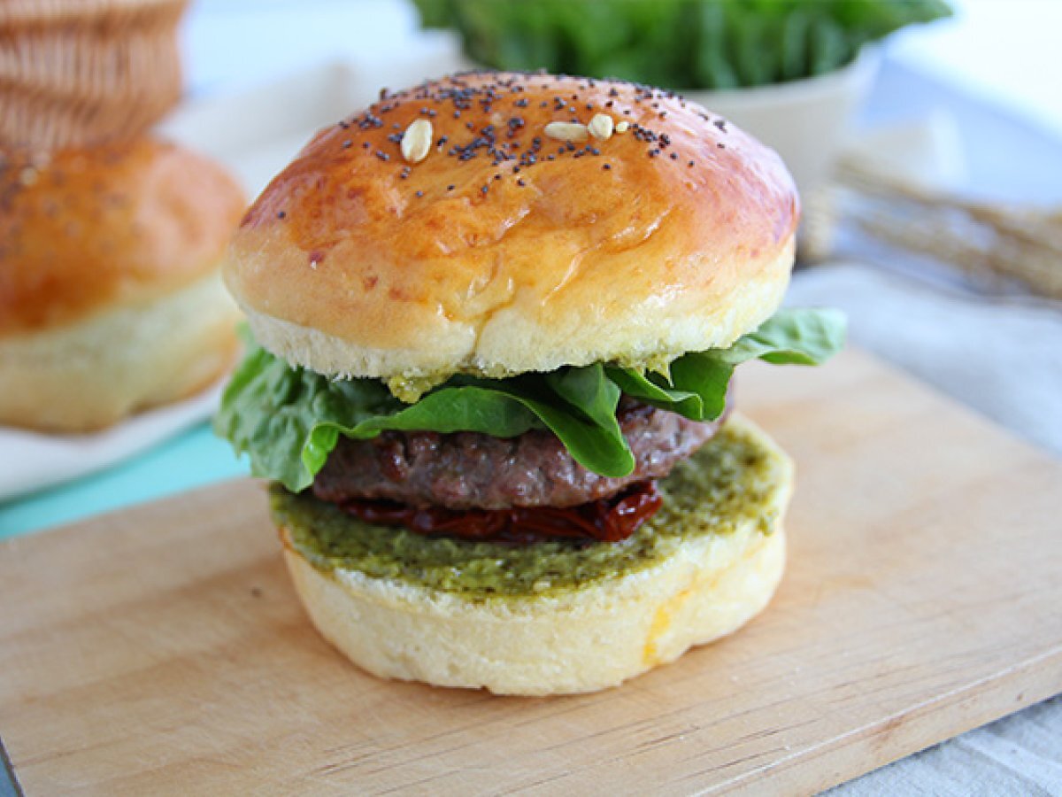Ein hausgemachter Burger ist immer besser, oder? Der Beweis mit unserem Hamburger-Rezept mit italienischen Aromen! Pestosauce, sonnengetrocknete Tomaten, Mozzarella ... „made in“ italienische Gerichte, die wir gerne mit 2 Scheiben Burgerbrot und einem guten Rindersteak kombinieren. Ein supereinfaches Rezept, das mit Pommes (auch selbstgemacht ;-)) nicht fehlen darf.