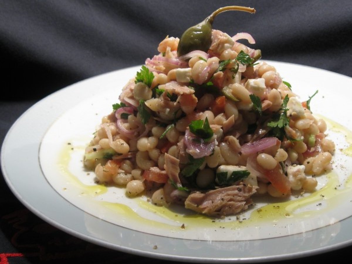 - Am nächsten Tag abgesaugt, mit Olivenöl, Rotweinessig, Salz und Pfeffer gekleidet.
