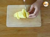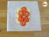 Schneiden Sie ein großes Quadrat Pergamentpapier aus. Olivenöl darüber gießen. 9 Kartoffelscheiben und 6 Tomatenscheiben darauf legen.