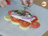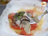 Legen Sie die Papillote für 30 Minuten bei 180 °C in den Ofen. Nehmen Sie die Folie heraus, öffnen Sie sie, bestreuen Sie sie mit gehackter frischer Petersilie und servieren Sie!