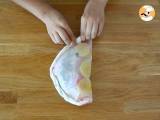 Schließen Sie die Folie: Falten Sie das Backpapier in zwei Hälften und verschließen Sie dann die beiden Kanten, indem Sie sie wie einen Hausschuh falten.