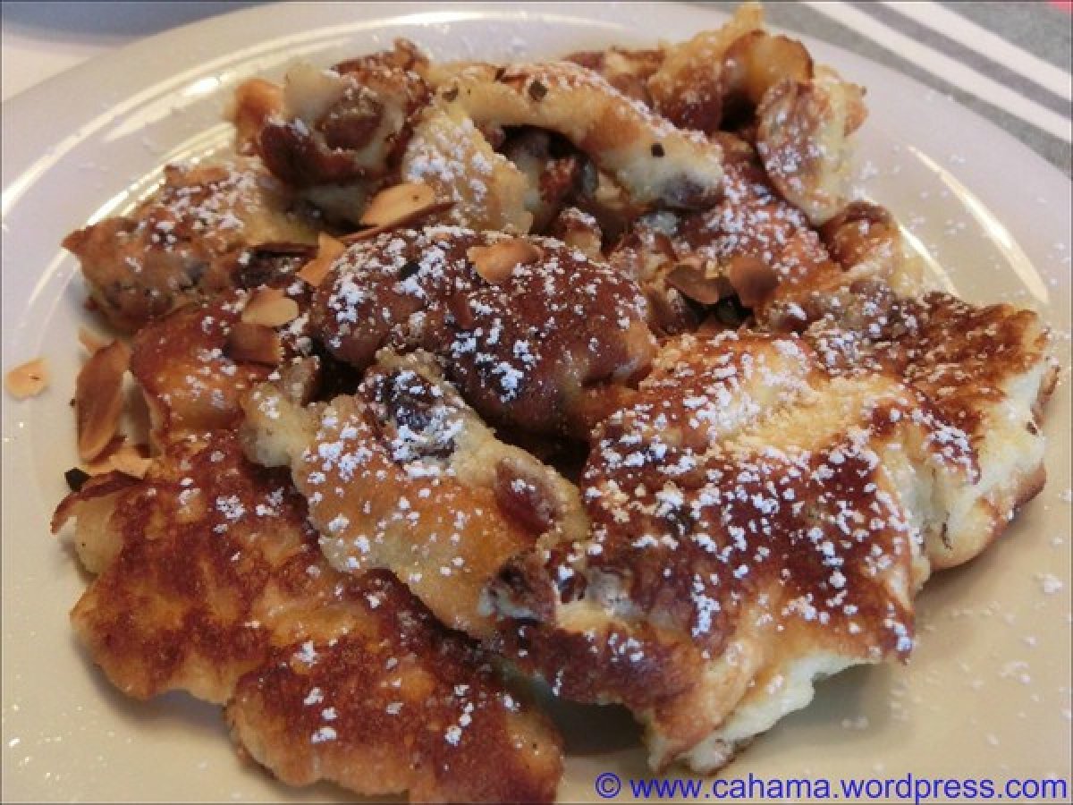 - Den Pfannkuchen mit zwei Gabeln in Stücke zupfen, Mandelblättchen und ein Stückchen Butter zugeben.