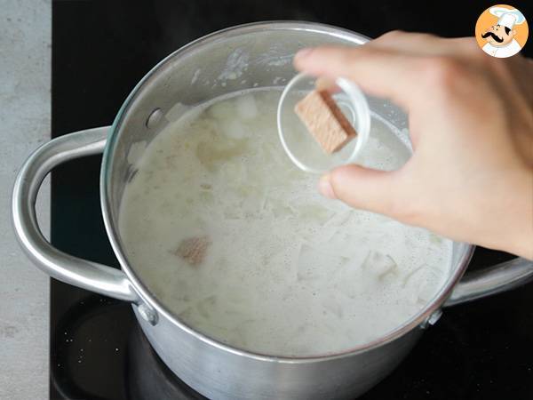 Bedecken Sie das Ganze mit Wasser und schieben Sie einen Brühwürfel hinein.