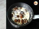 Geben Sie die Morcheln und die Sahne hinzu und rühren Sie gut um. Lassen Sie die Sahne 2 Minuten kochen und nehmen Sie sie dann vom Herd.