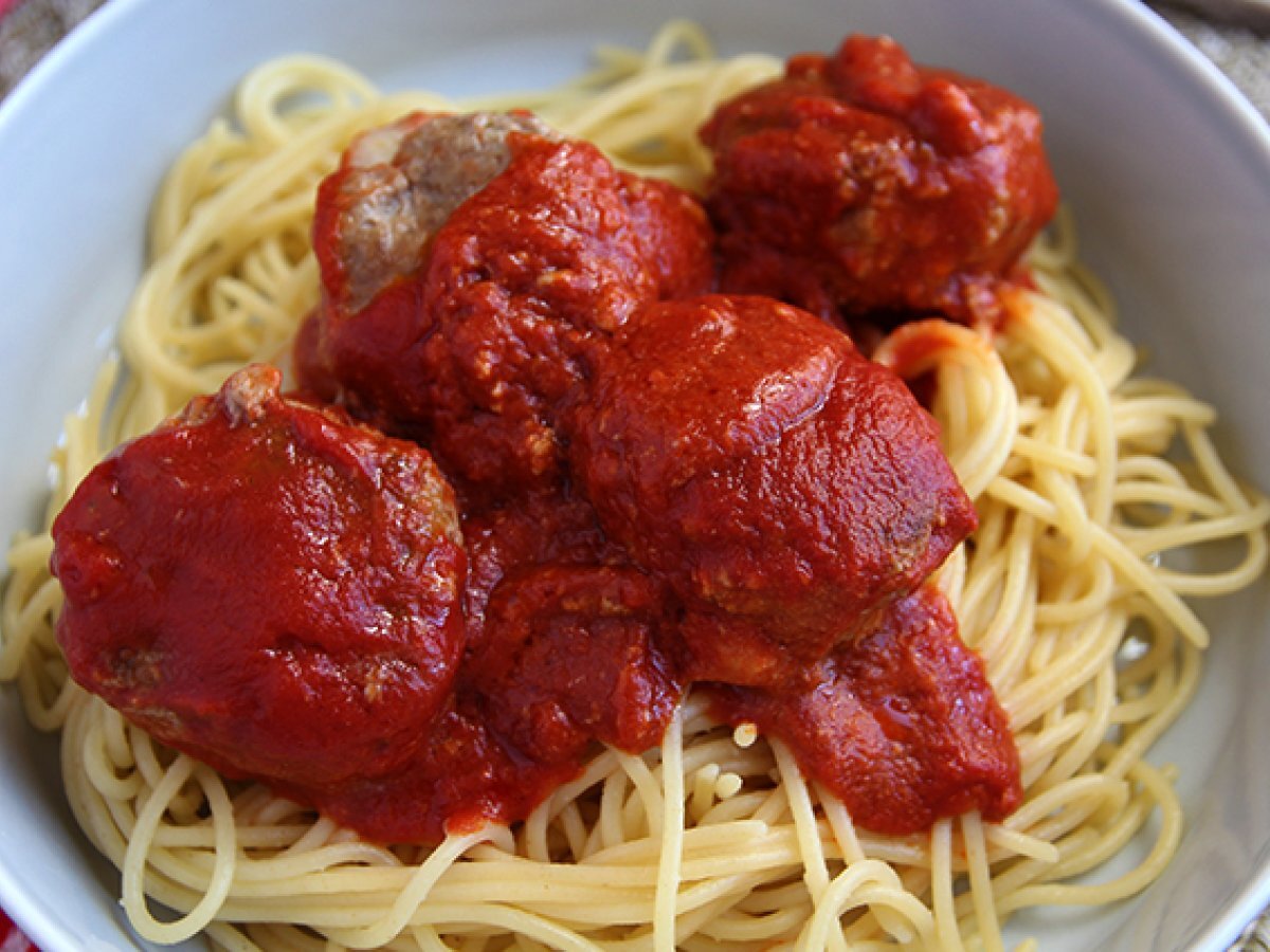 Zum Mittagessen bringen wir Ihnen ein sehr komplettes Gericht: Fleischbällchen, gefüllt mit Mozzarella, auf einem guten Teller Spaghetti! In der Tomatensoße sind sie sehr saftig und in der Mitte durch den Käse geschmolzen. Sie werden sich wie in einem italienischen Film fühlen :D