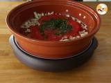Olivenöl am Boden der Tajine erhitzen. Die gehackte Zwiebel kurz anbraten, dann das Tomatenmark, die gehackten Kräuter, Salz, Pfeffer und Kreuzkümmel hinzufügen. Mischen und bei sehr schwacher Hitze kochen.