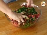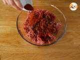 Diese Mischung zum Hackfleisch geben und mit den Händen gut vermischen. Passen Sie die Gewürze bei Bedarf an.