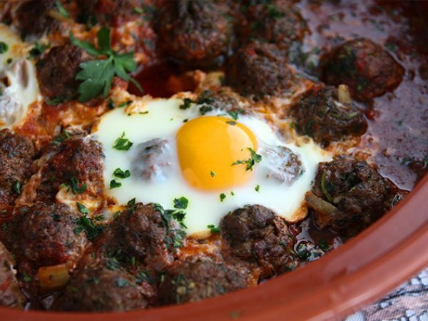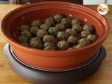 Formen Sie Kugeln in der Größe eines Tischtennisballs und legen Sie diese auf die Tomatensauce in der Tajine.