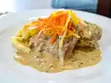 - Legen Pilzköpfe in eine Auflaufform füllen mit kleinen Stücken Kalbsbries, Pfeffer und Kräuter verteilen Pilzen und Speck-Mischung über sie.