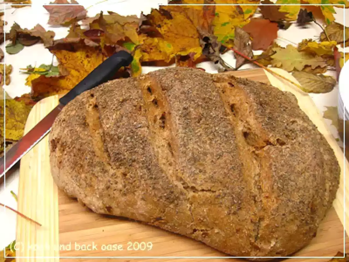 Mehl mit Salz, Mischung Hagebutten und gerösteten Zwiebeln. Pumpen Sie die Hefe mit Honig in Wasser und zum Mehl geben. - Kneten und gehen lassen, kneten wieder, Gestalten von Brot, lassen Sie sie wieder los.