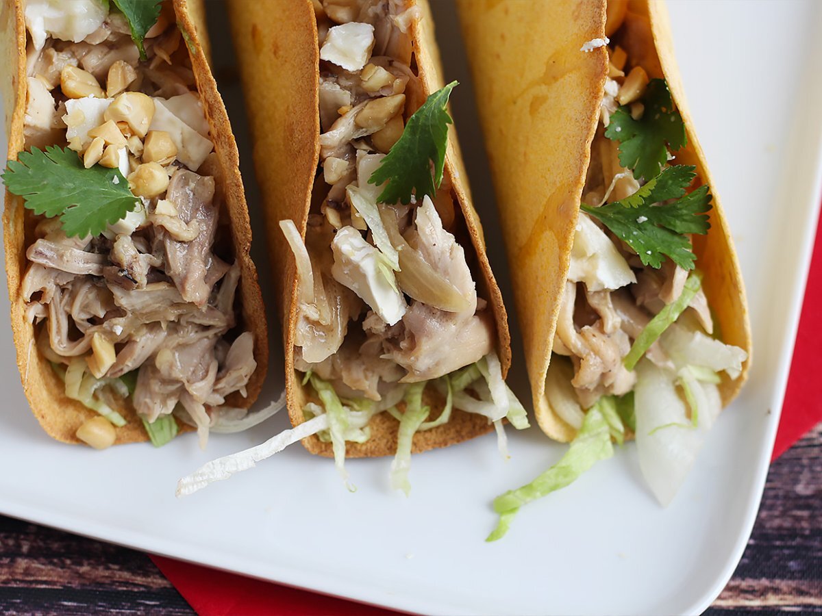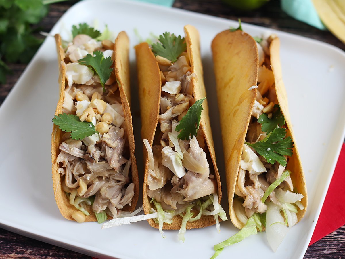 Heute mischen wir mexikanische und thailändische Küche in diesem Rezept für knusprige Tacos, garniert mit Hühnchen und Satay-Sauce. Was man insgesamt für die Zubereitung einer originellen Mahlzeit braucht Einfachheit ;-) Die Basis ist ganz einfach: im Ofen gebackene Weizenpfannkuchen. Für die Füllung haben wir Hähnchenschenkel verwendet, die in Kokosmilch und Erdnussbutter gekocht wurden. Genug, um dank dieser Geschmackskombination ein wenig Sonnenschein auf Ihren Teller zu zaubern.