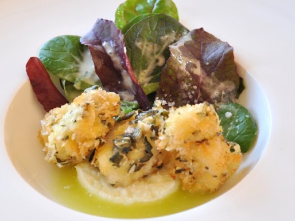 In Würfel schneiden Kabeljau, zuerst in Mehl, dann in Ei, Semmelbrösel und panko Rolle Kürbiskerne. - Godlbraun Speiseöl.