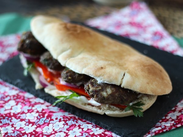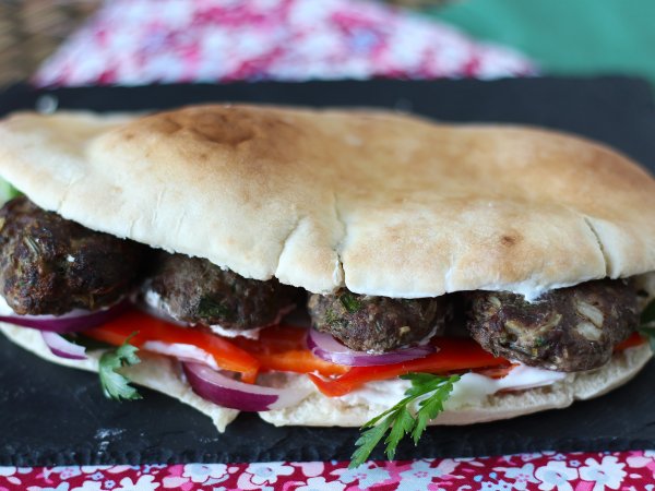 Das Fladenbrot aufschneiden, von innen mit Cacik bestrichen und mit dem gegrillten Köfte füllen.