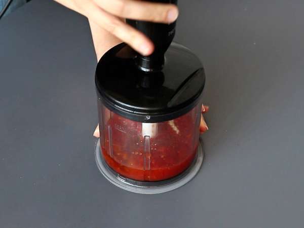 Geben Sie die geschälten Tomaten, das Olivenöl, Salz, Pfeffer und die Knoblauchzehe in einen Blitzhacker und vermengen Sie alles.