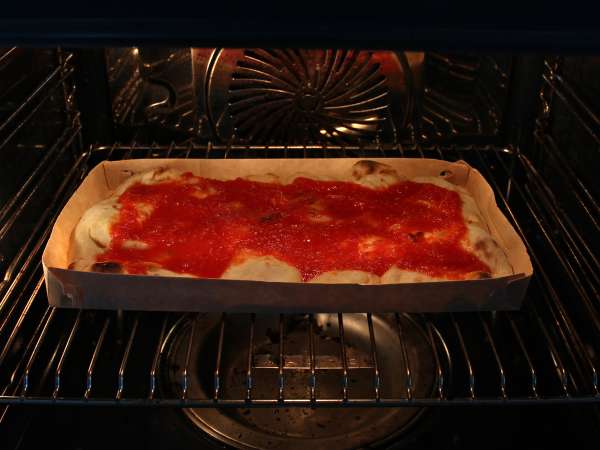 Verteilen Sie diese Tomatensoße auf der Pinsa.
