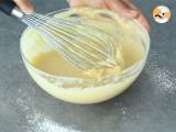 Die Eier in einer Schüssel verquirlen. Das Mehl und das Backpulver sieben und verrühren. Nach und nach die Milch und dann das Olivenöl hinzugeben und gut verrühren.