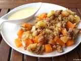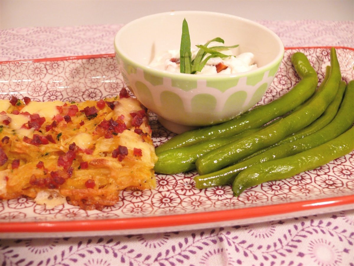 Kürbis-kartoffel-krustikuchen mit estragonschmand und bohnen