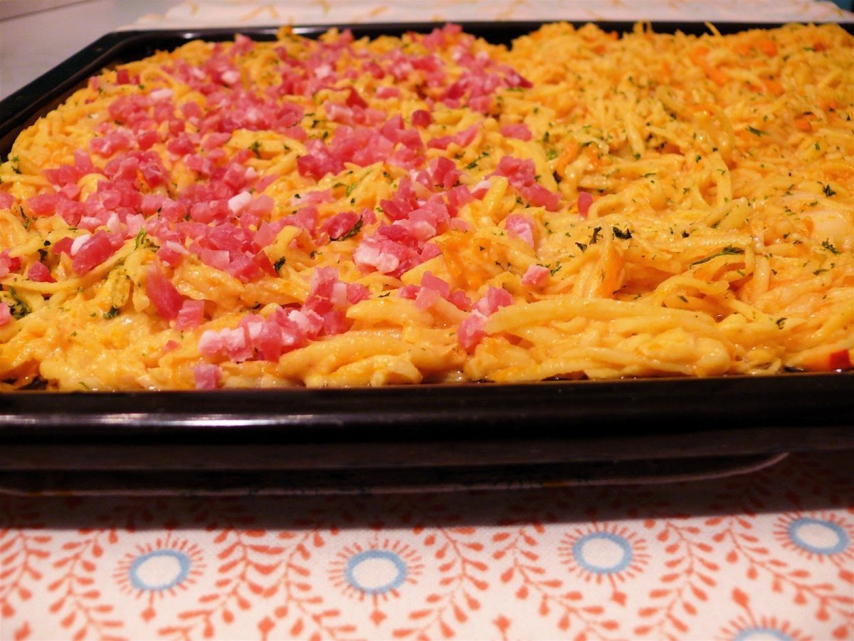 Ein Backblech wird mit Öl eingepinselt und die Kartoffel-Kürbismasse darauf verteilt. Nun verteilt ihr die Schinkenwürfel auf dem Blech und backt den Krustikuchen