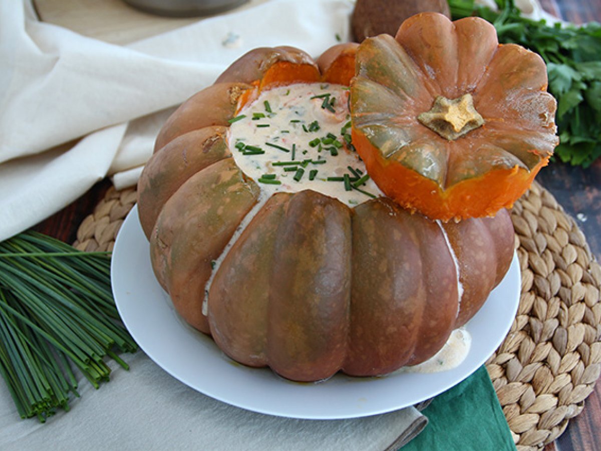 Kratzen Sie beim Servieren die Seitenwände des Kürbis ab, damit kein Krümel verloren geht!