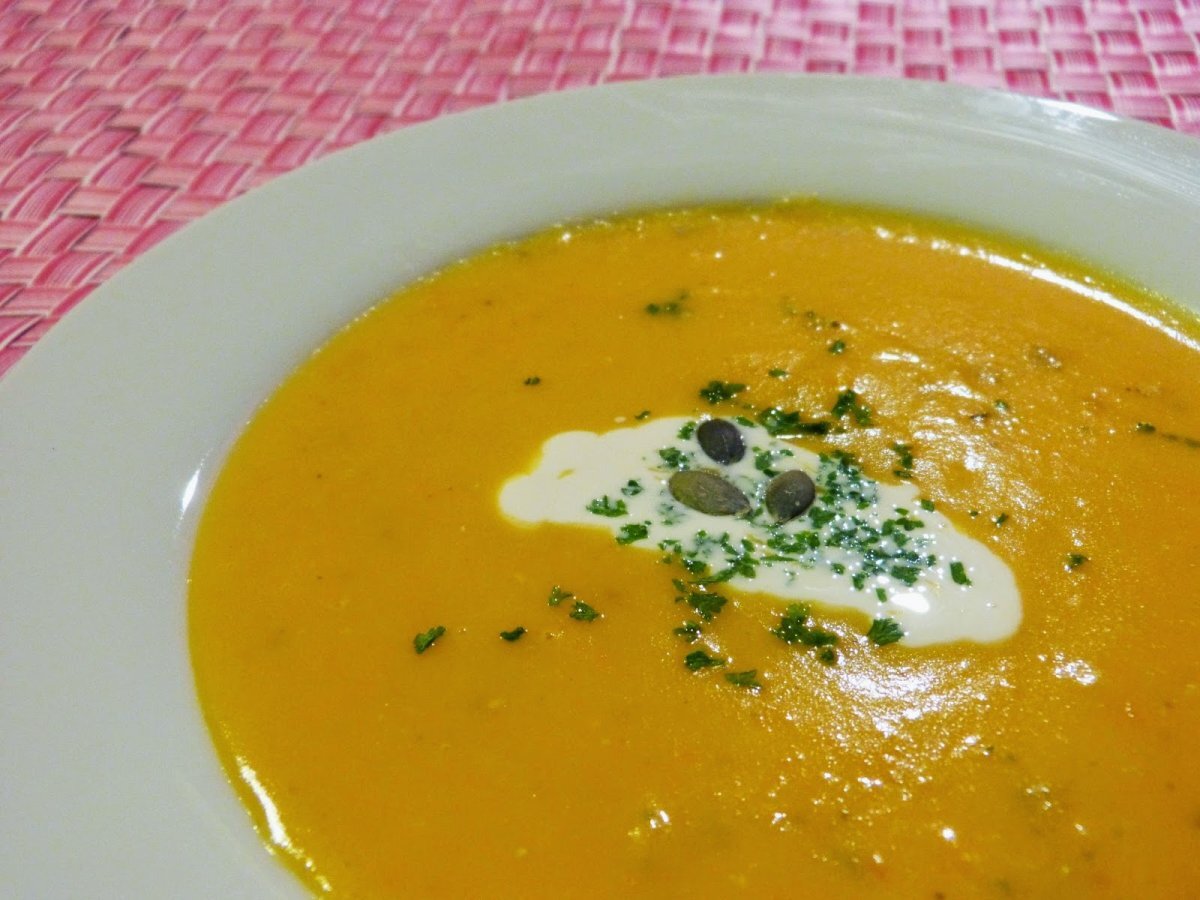 - Dann wird das Ganze mit einem Stabmixer püriert. Zum Schluss die Kürbissuppe noch mit etwas Salz, Pfeffer, Muskat und Petersilie abschmecken und mit einem EL Schmand und Kürbiskernen garniert servieren.