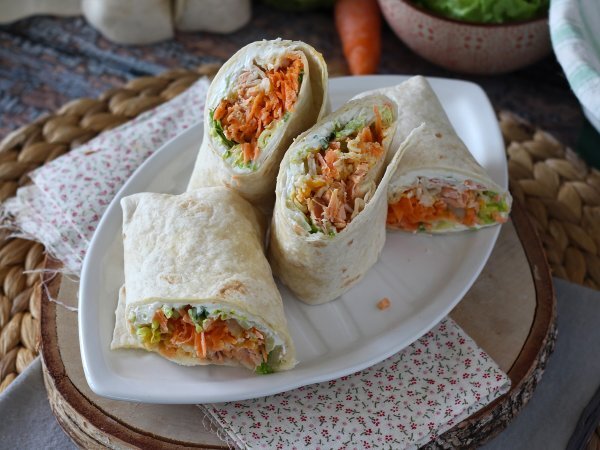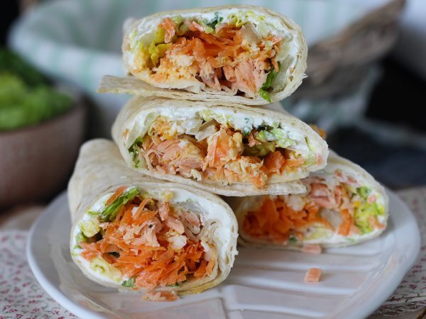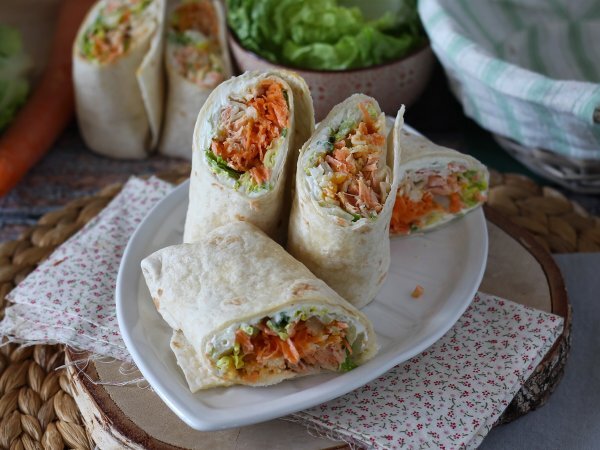 Die Picknick-Saison steht vor der Tür und was gibt es Schöneres als leckere Wraps für eine Mahlzeit zum Mitnehmen? Dieses einfache und gesunde Rezept mit gekochtem Lachs (Mikrowelle - Wellen, um Zeit zu sparen), Karotten und Salat sind perfekt für ein Mittagessen für unterwegs! Dank der Weizentortilla bleibt Ihre Füllung an Ort und Stelle: Einfach aufrollen und fertig, eine Option von Sandwich originell und frisch für Ihre Lunchbox :-) Entdecken Sie unten alle Schritte zur Herstellung dieser Wraps ↓
