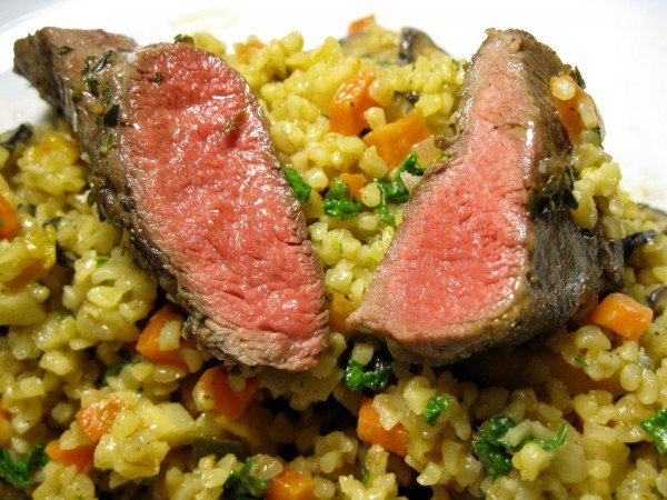 - In Olivenöl braten, rühren in 1 Tasse Bulgur, ablöschen mit Wein.