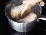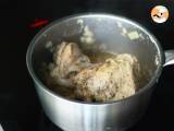 Wasser, Honig, Thymian und Rosmarin, Salz und Pfeffer hinzufügen und zum Kochen bringen. Abdecken und bei sehr schwacher Hitze 1 Stunde und 45 Minuten kochen lassen.