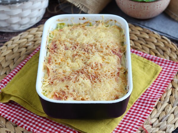 - Heizen Sie den Backofen auf 200 °C vor, indem Sie ihn auf- und abheizen. Legen Sie den länglichen Lauch in eine für den Ofen geeignete Form. Als nächstes legen wir eine Schicht Käsescheiben drauf und darauf eine weitere Schicht Kochschinken. Zum Schluss bedecken wir es mit einer großzügigen Schicht geriebenem Käse.