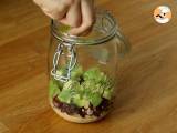 Gießen Sie die Soße in das Glas. Die Bohnen darüber geben. Dann die Avocado hinzufügen. Gießen Sie etwa 1 Esslöffel Limettensaft über die Avocado, damit sie nicht dunkel wird.