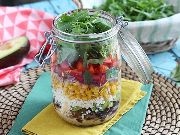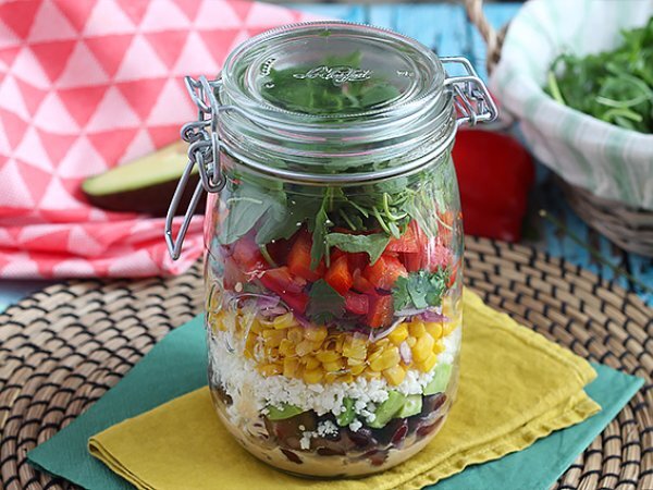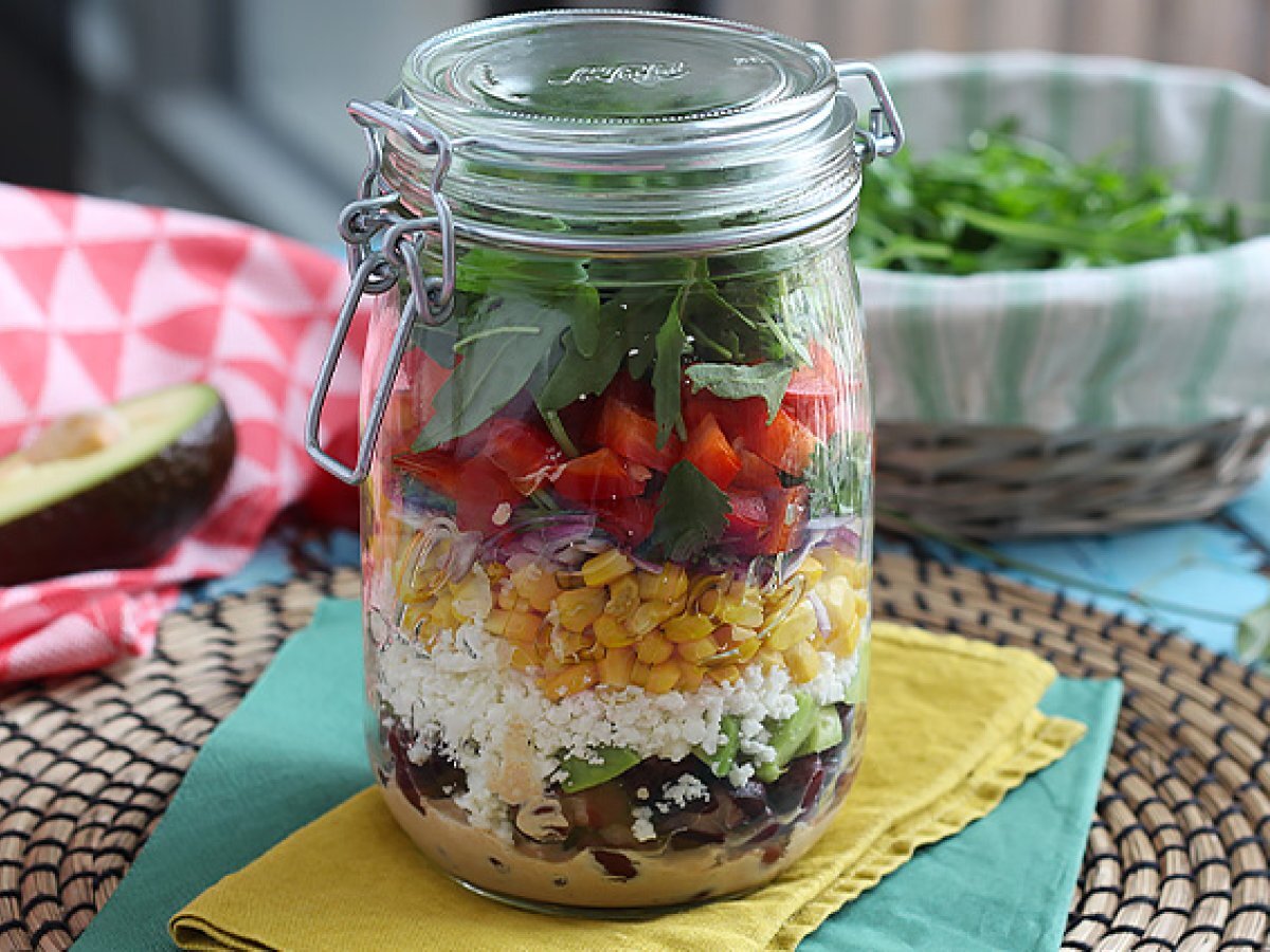 Den zerbröckelten Feta hinzufügen, dann den Mais und dann die gehackten roten Zwiebeln. Dann Koriander und rote Paprika hinzufügen. Mit Rucola bis zum Rand des Glases füllen und verschließen.
