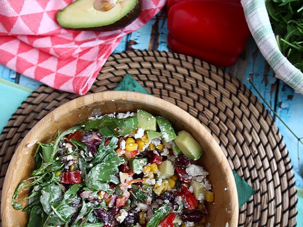 Paprika und Avocado in Würfel schneiden. Koriander und rote Zwiebel hacken, Feta zerbröckeln. Mais und Kidneybohnen gut abtropfen lassen.